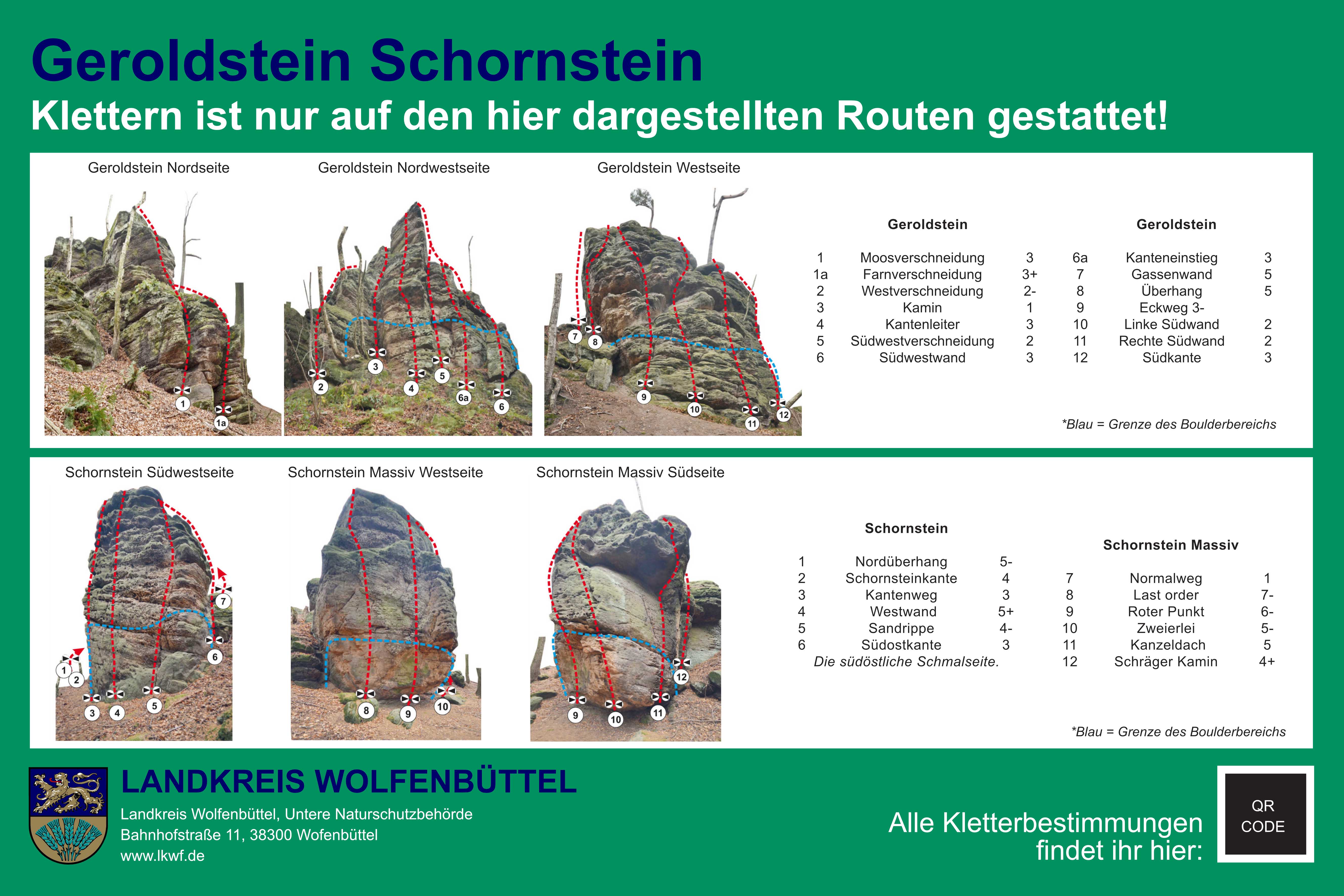 - Felsbereiche außerhalb der gekennzeichneten Routen und Boulderbereiche dürfen nicht betreten werden. Neue Routen sind unzulässig.