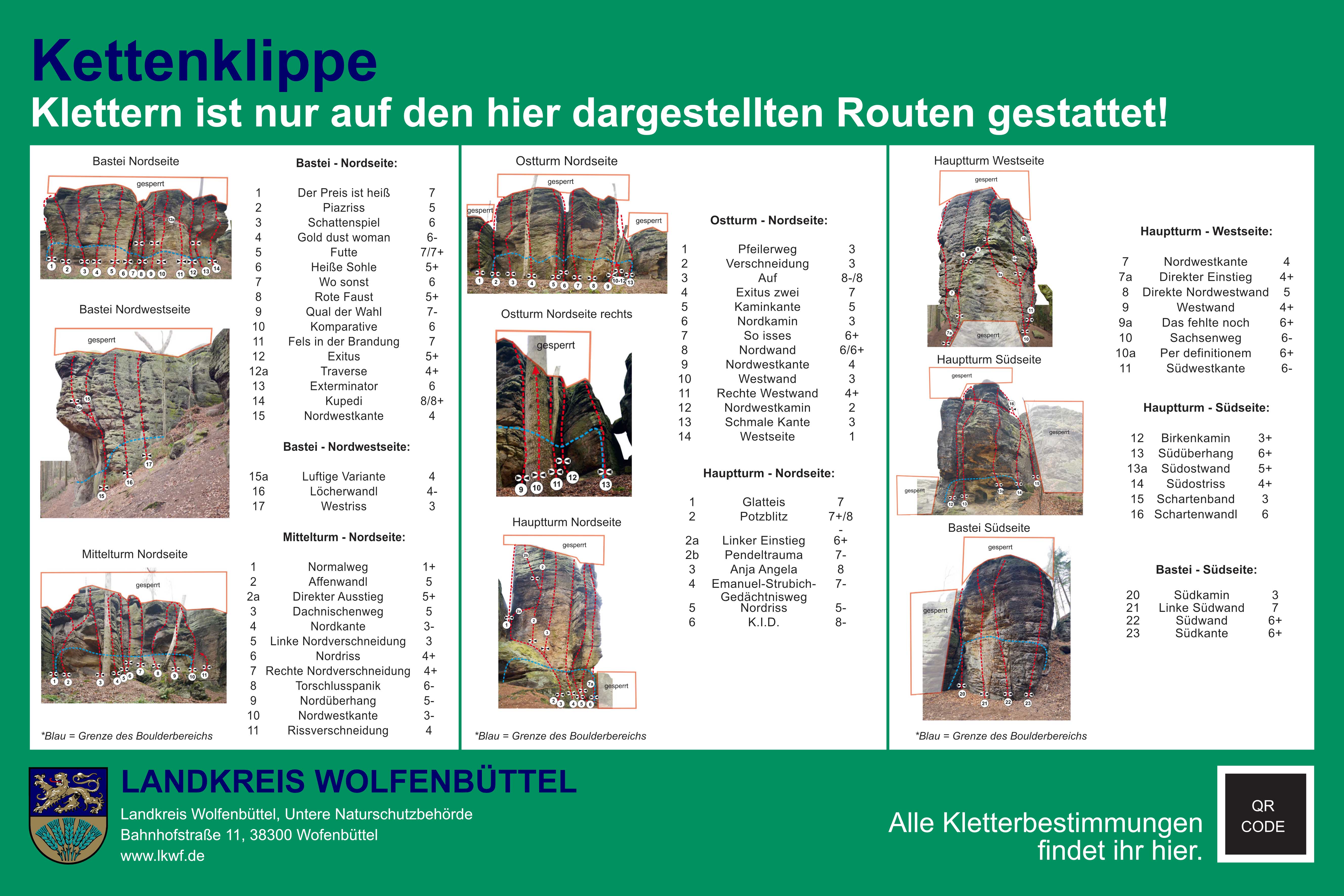 - Felsbereiche außerhalb der gekennzeichneten Routen und Boulderbereiche dürfen nicht betreten werden. Neue Routen sind unzulässig.