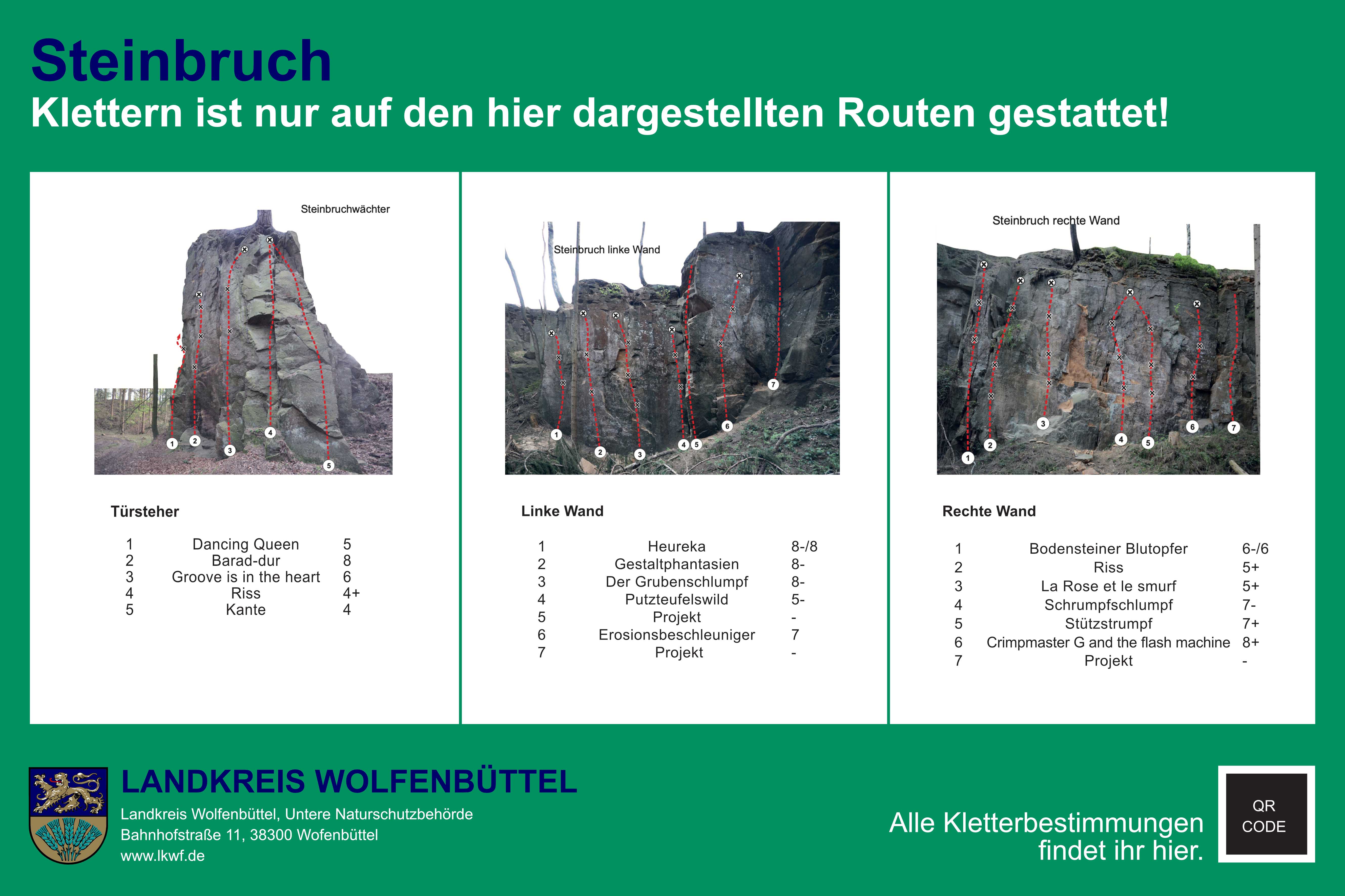 Auf dem Schild sind die gekennzeichneten, erlaubten Kletterrouten unter Verwendung der Anlage 1 mit den Routenbezeichnungen und der Anlagen 2 mit den Felstopos abzubilden.