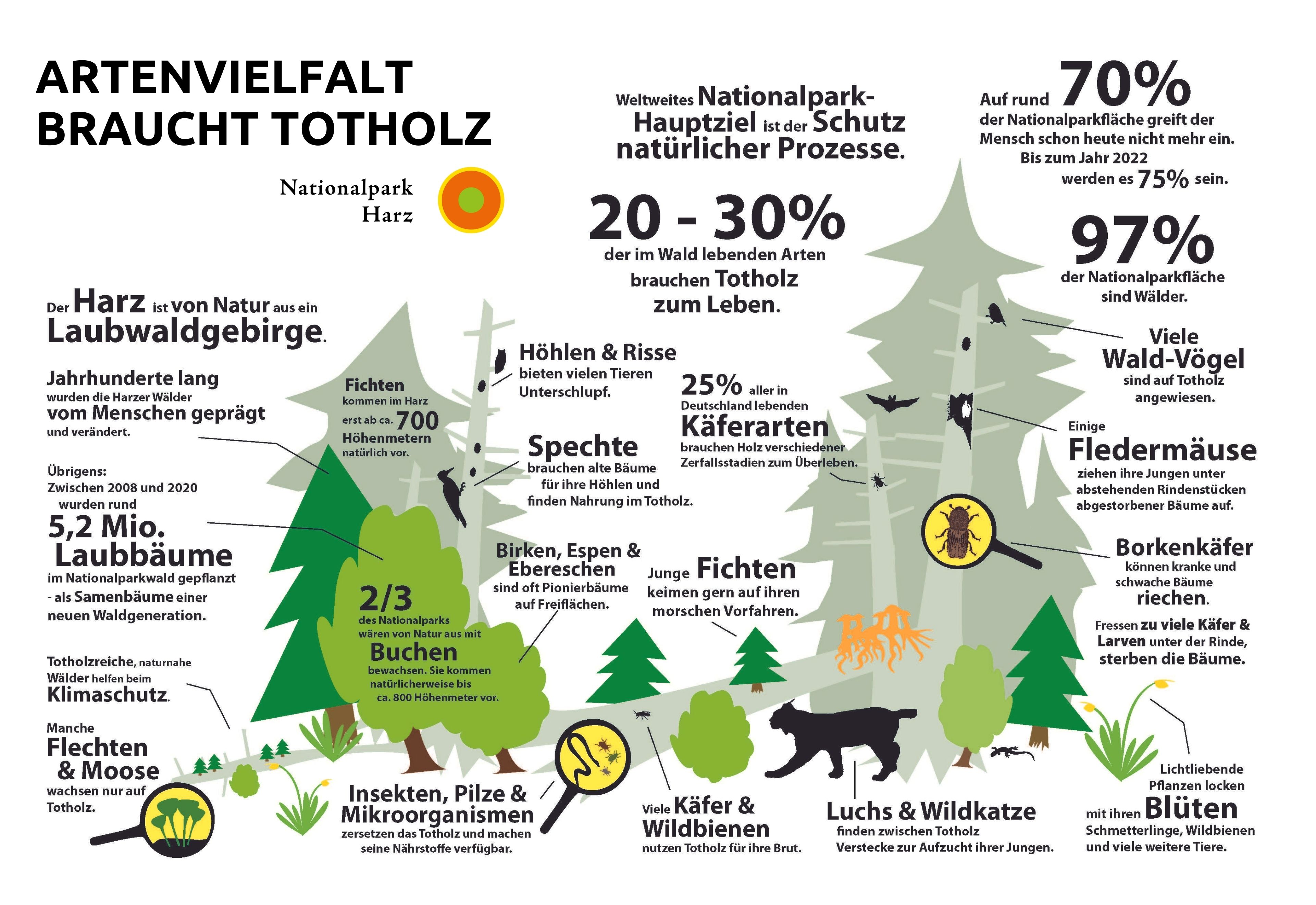 Im Harz entwickeln sich „Gegenspieler“ der Borkenkäfer wie der Ameisenbuntkäfer und viele weitere Insekten im Holz und unter der Rinde. Ein Viertel aller in Deutschland lebenden Käferarten sind auf Holz verschiedener Zerfallsstadien angewiesen. Auch zahlreiche Wildbienen nutzen Totholz für ihre Brut. Zwischen den morschen Stämmen finden Amphibien, Reptilien, Vögel und Säugetiere wie Wildkatze oder Luchs Unterschlupf. Der Totholzverhau hindert Rehe und Hirsche am Verbiss des neu entstehenden Waldes.
