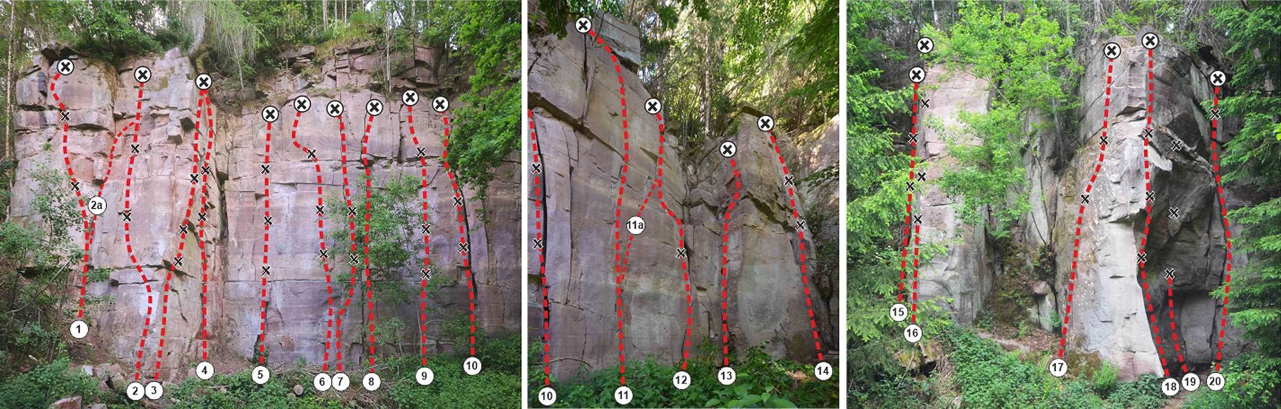 Die vielseitige Kletterei bewegt sich an Kanten, Verschneidungen und Rissen von hoher Qualität und Originalität. Einige Routen sind durchgebohrt, an den Rissen kann sehr gut mobil gesichert werden. Ein Friendset für dünne Finger- bis Faustrisse (Black Diamond Camalot 0,3 bis 2) ist notwendig. Die Routen sind bunt gemischt zwischen 4 und 8-. Die Wand ist südlich exponiert und windgeschützt, daher auch für Wintertage gut geeignet. Der Steinbruch liegt im Landschaftsschutzgebiet Wesergebirge-Sollingvorland, das Klettern wurde 2019 auf Antrag von DAV und IG Klettern durch den Landkreis Holzminden gestattet.