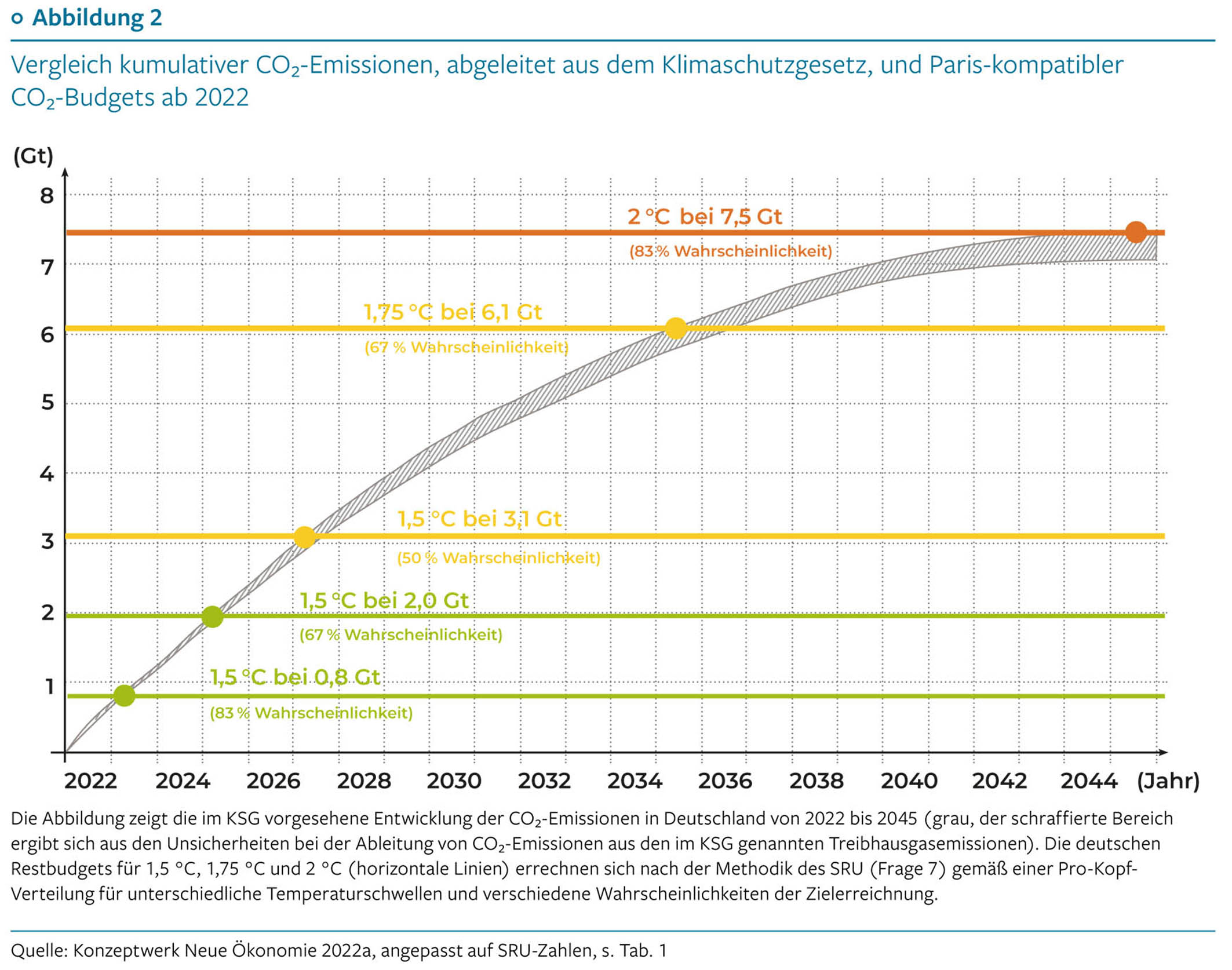 Zur Berechnung des Reduktionspfades ging die Bundesregierung von 7,5 Gigatonnen CO2-Restbudget bis zur Klimaneutralität aus. Das ist laut der SRU-Studie viel zu hoch. Für das 1,5 Grad-Ziel, bei dem die Krisenfolgen noch als halbwegs kontrollierbar angesehen werden, sei das Restbudget der Klimagase weniger als halb so groß (siehe Grafik unten).