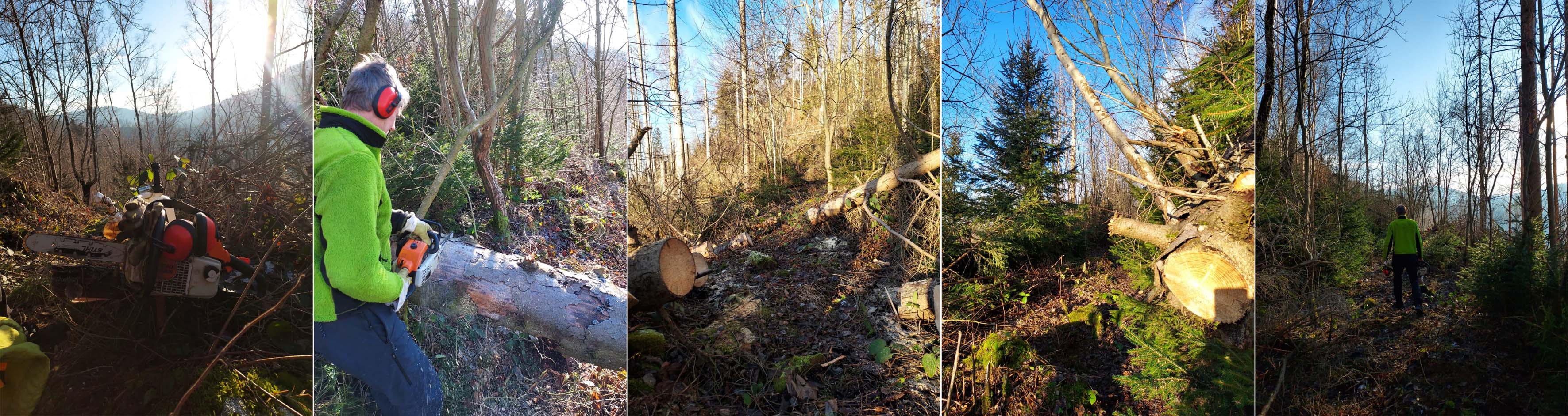 Der Alte Forstweg zwischen Unterer Studentenklippe und Ziegenrückenturm mit Zugang zum Kaminturm und Hammer wird freigeschnitten.