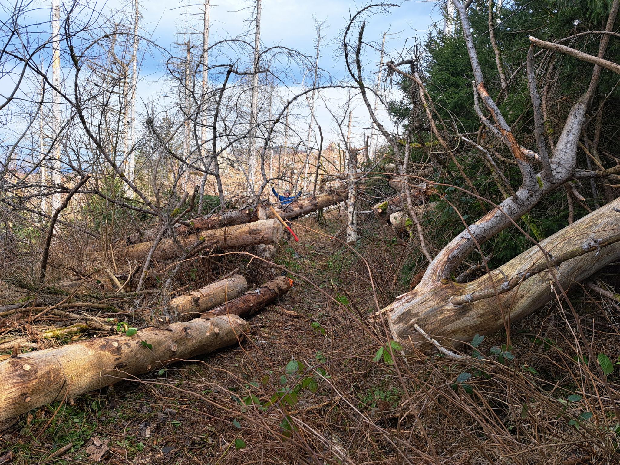 Die klimawandelbedingt trockenheißen Sommer und knabbernden Borkenkäfer haben die alten Fichtenbestände im Okertal großflächig absterben lassen. Die toten Bäume liegen mikadohaufengleich kreuz und quer und versperren viele der bisherigen Felszustiege. In den letzten Monaten haben wir in Absprache mit Revierförster Daniel Goebel viele wieder freigeschnitten. Andere bleiben auf längere Zeit nicht begehbar, weil stehendes Totholz umfallen und Wanderer gefährden könnte.