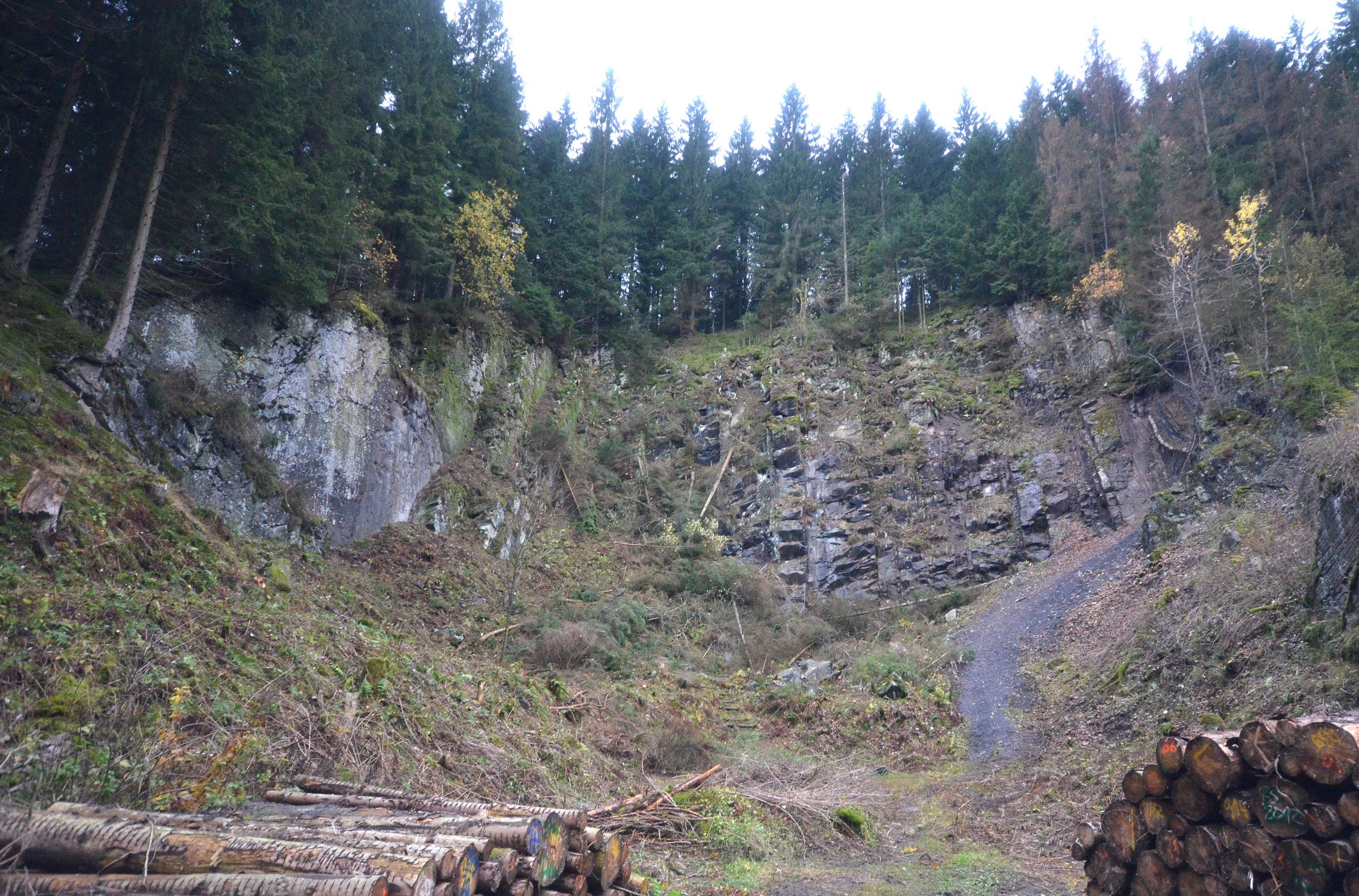 Etwa 500 Meter südlich der Sepp-Ruf-Hütte der Sektion Hamburg und Niederelbe liegt im Innerstetal unweit von Clausthal-Zellerfeld der Bleihütte-Steinbruch.